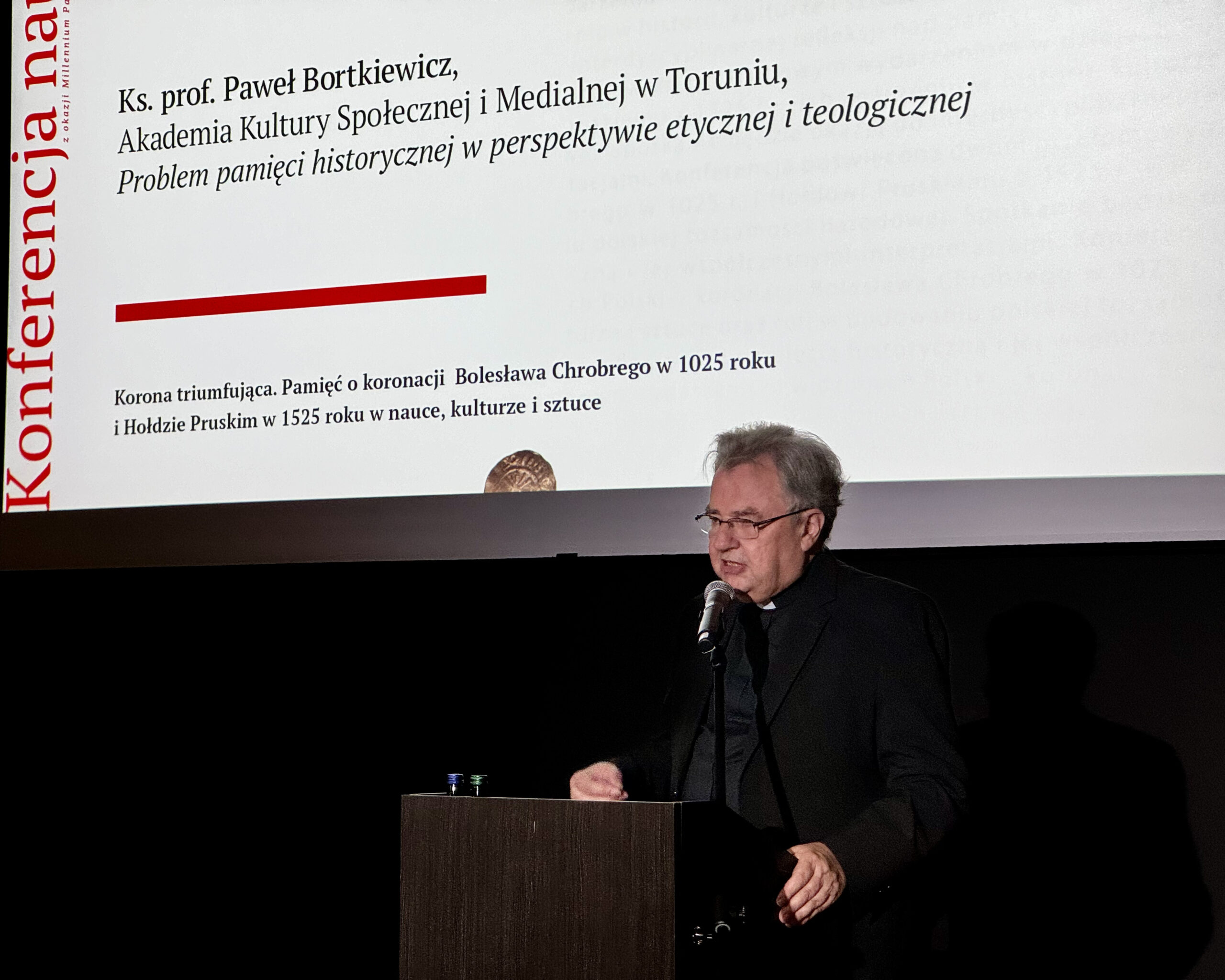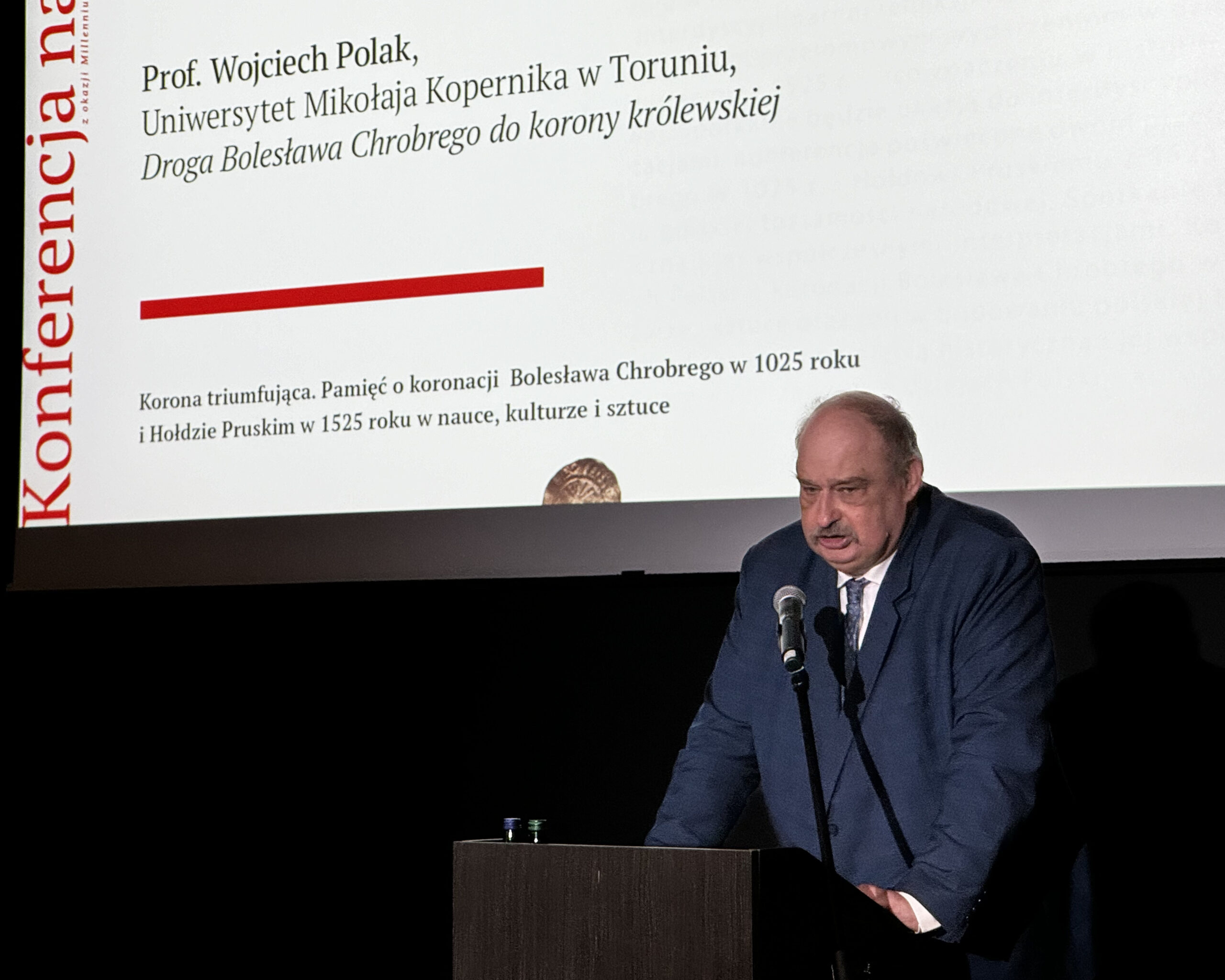 Pierwszą sesję otworzył ks. prof. Paweł Bortkiewicz (AKSiM), który wskazał na moralny i teologiczny wymiar pamięci historycznej, akcentując odpowiedzialność za jej zachowanie i przekaz. Prof. Wojciech Polak (UMK) przedstawił proces polityczny i dyplomatyczny prowadzący do koronacji Bolesława Chrobrego, kreśląc obraz władcy jako konsekwentnego architekta suwerenności państwa.