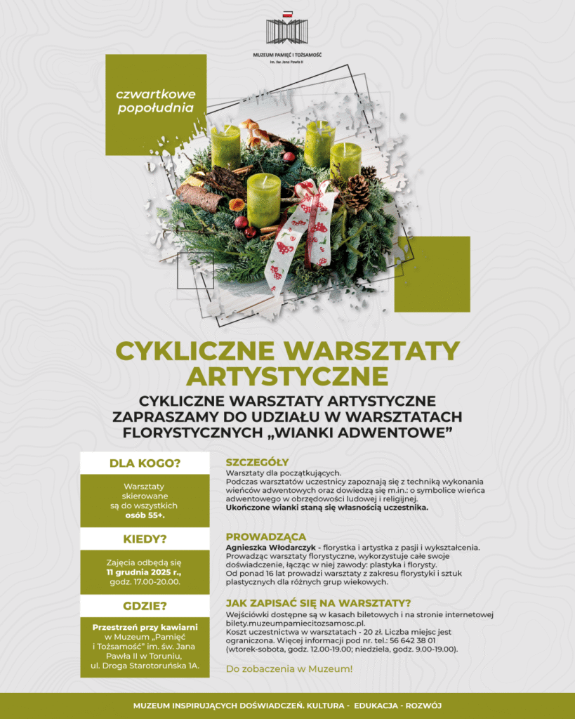 Podczas warsztatów uczestnicy zapoznają się z techniką wykonania wieńców adwentowych oraz dowiedzą się m.in.: o symbolice wieńca adwentowego w obrzędowości ludowej i religijnej. Ukończone wianki stają się własnością uczestnika.