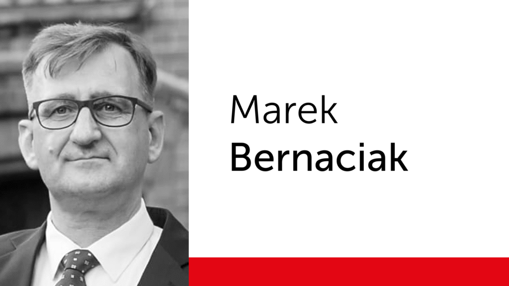 Pan Marek Bernaciak. Urodzony się 17 kwietnia 1965 r. w Toruniu, gdzie w 1985 r. ukończył Technikum Budowlane. Już jako uczeń angażował się w działalność opozycyjną: w latach 1983–1985 współpracował z podziemnym pismem „Grześ”, uczestniczył w akcjach ulotkowych i malowaniu napisów, prowadził bibliotekę Wszechnicy Młodzieżowej oraz organizował akcje solidarnościowe, m.in. z młodzieżą protestującą w Miętnem. Równocześnie kolportował prasę podziemną i działał w Duszpasterstwie Młodzieżowym przy kościele Matki Boskiej Zwycięskiej. W latach 1987–1989 pracował jako technik w zakładach Towimor, gdzie współtworzył struktury „Solidarności” oraz działał w Ruchu „Wolność i Pokój”. Od 1988 r. uczestniczył w odtwarzaniu „Solidarności” w Towimorze, wspierał sierpniowy strajk w Stoczni Gdańskiej, dostarczając żywność i prasę podziemną. W grudniu 1988 r. współorganizował manifestację rocznicową, zaś w 1989 r. aktywnie działał w kampanii Komitetu Obywatelskiego „Solidarność” oraz brał udział w strajku Niezależnego Zrzeszenie Studentów Uniwersytetu Mikołaja Kopernika w Toruniu. Za swoją działalność został odznaczony Srebrnym Krzyżem Zasługi w roku 2000), odznaką Zasłużony Działacz Kultury w roku 2001, a w 2011 roku Krzyżem Kawalerskim Orderu Odrodzenia Polski.