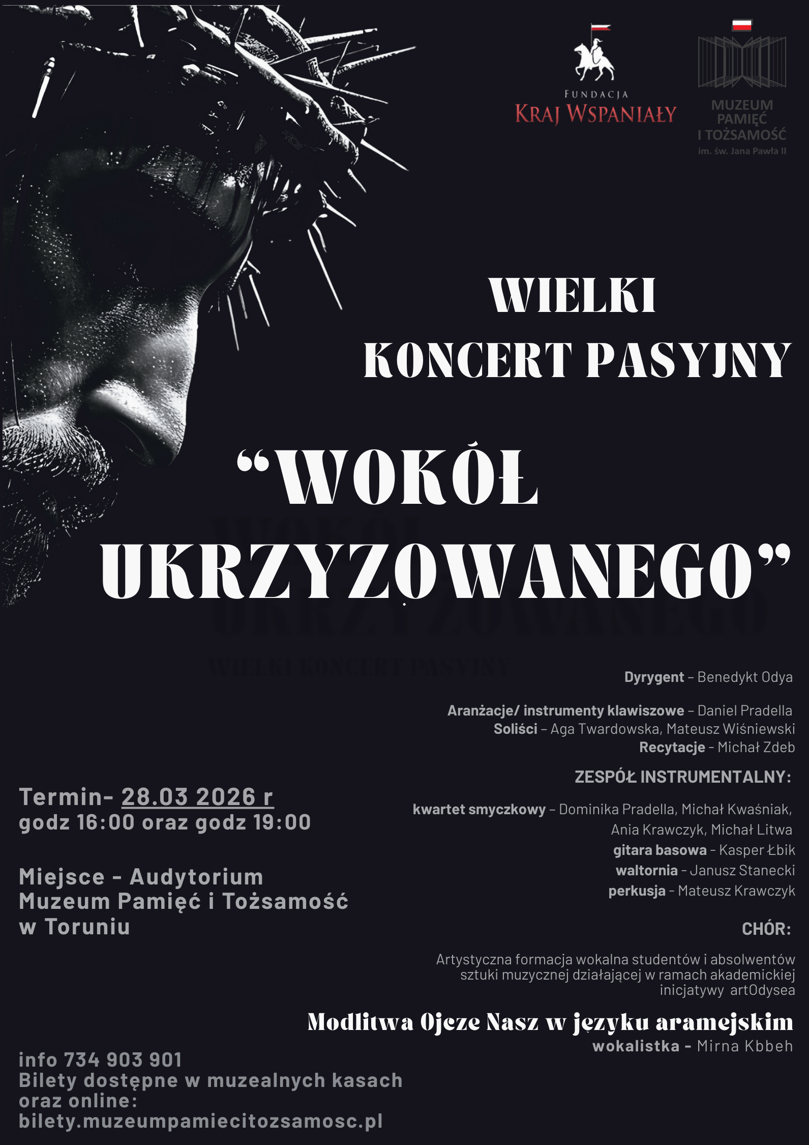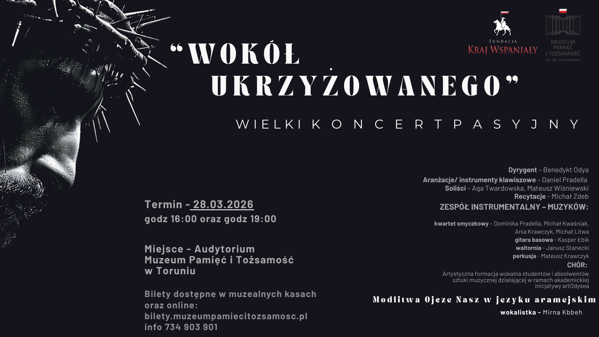 Z głębokiego poczucia obowiązku dbania o polską kulturę, historię oraz fundamenty naszej tradycji, Fundacja Kraj Wspaniały ma zaszczyt zaprosić Państwa na wyjątkowe wydarzenie skłaniające do głębokiej refleksji i mające wymiar rekolekcyjny – koncert „Wokół Ukrzyżowanego”.