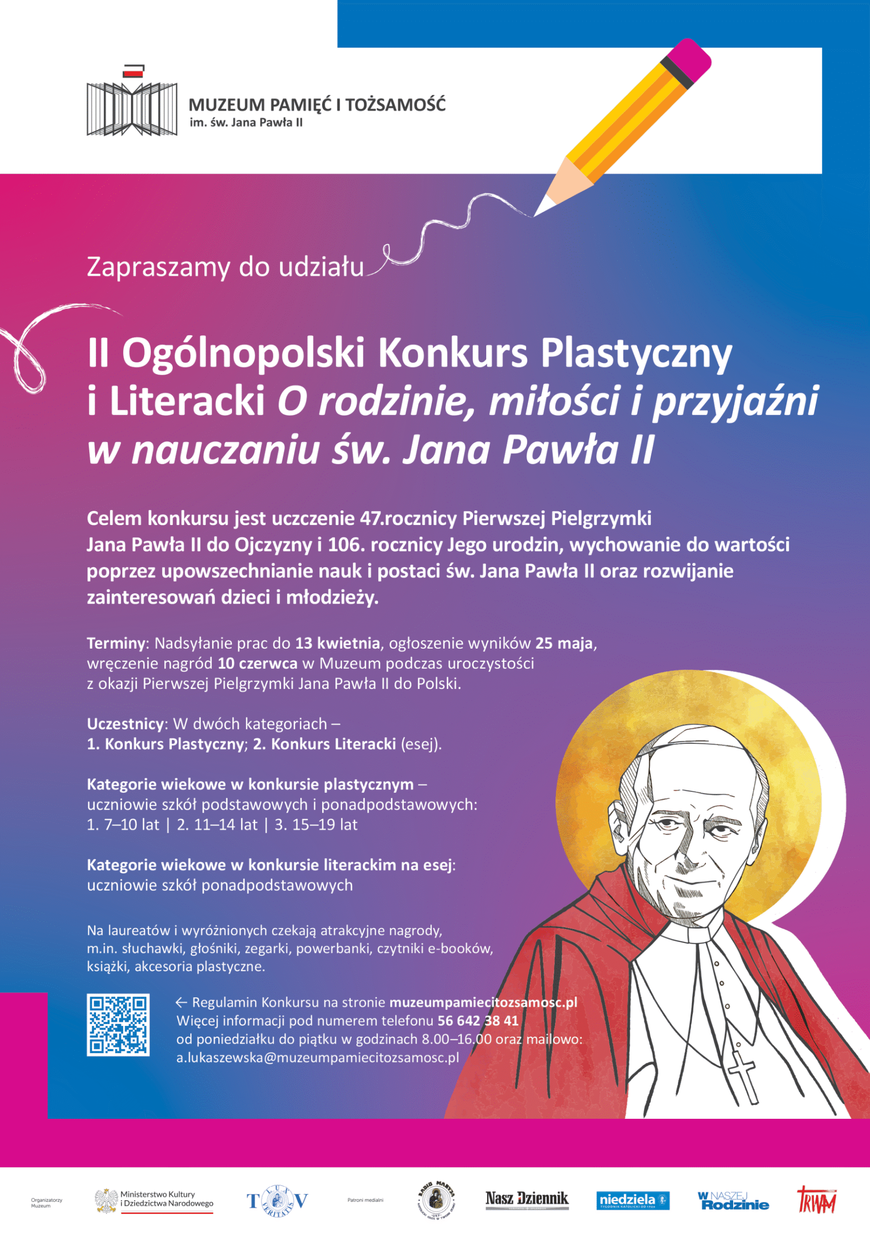 Zapraszamy dzieci i młodzież z całej Polski do udziału w II edycji Ogólnopolskiego Konkursu Plastycznego i Literackiego poświęconego nauczaniu i dziedzictwu Jan Paweł II.