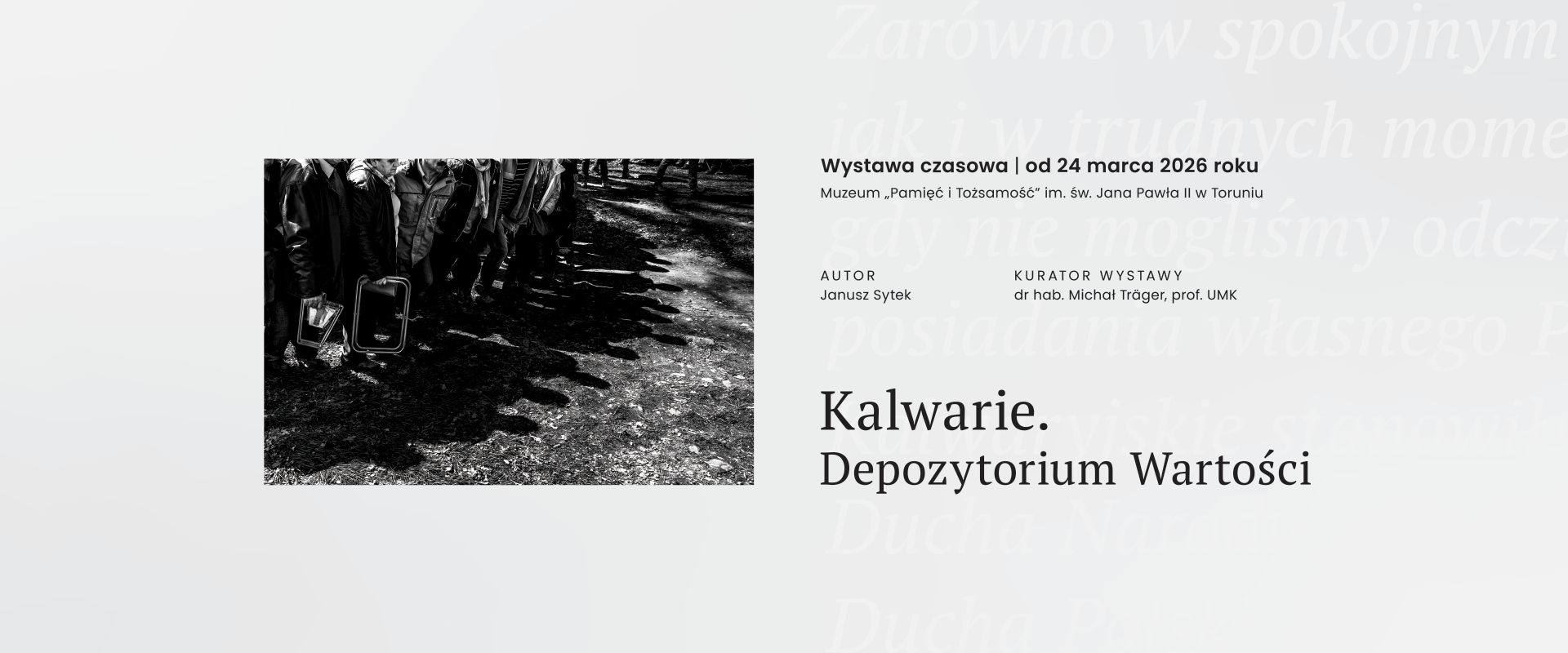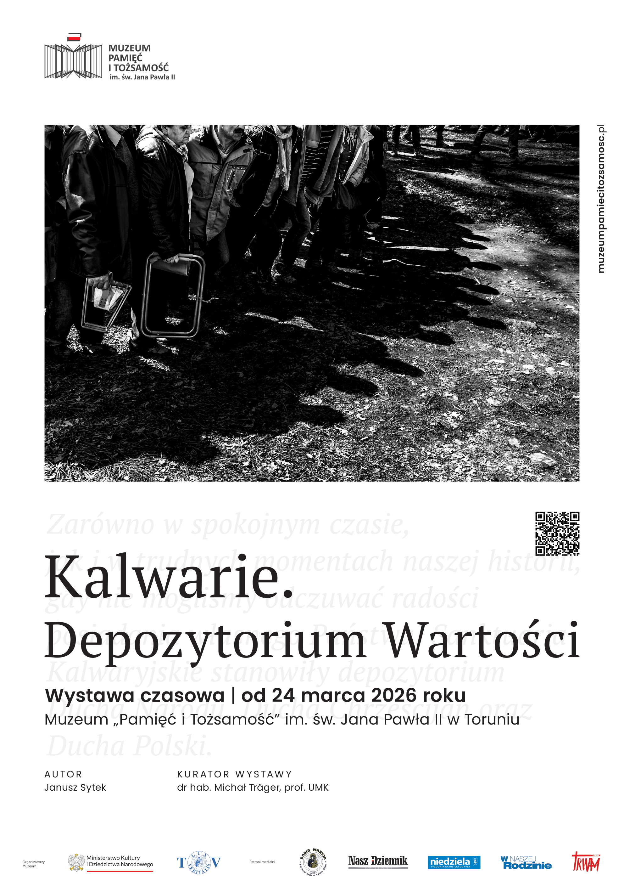 Wystawa czasowa „Kalwarie. Depozytorium Wartości” autorstwa Janusza Sytka, dostępna od 24 marca w Muzeum „Pamięć i Tożsamość” im. św. Jana Pawła II, to opowieść o duchowości, tradycji i wspólnocie zakorzenionej w polskim krajobrazie kulturowym. Poprzez cykl 40 czarno-białych fotografii artysta przedstawia trzy kalwarie: Zebrzydowską, Wejherowską i Pacławska, ukazując ich wymiar religijny, narodowy oraz lokalny. To także refleksja nad różnorodnością ludzkich postaw, reakcji i przeżyć towarzyszących pielgrzymowaniu oraz nad znaczeniem wielowiekowej tradycji kalwaryjskiej.